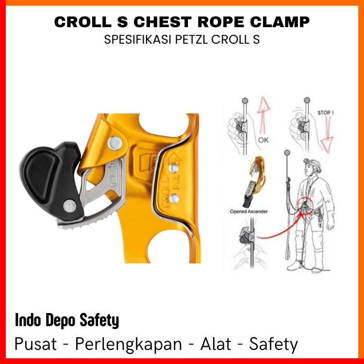 Sistem buka tutup “pinch opening” (dengan menjepit bagian tertentu) yang terintegrasi dalam badan clamp untuk membuka penjepit tali secara cepat dan menghindari tersangkut (snagging). Cam bergigi (toothed cam) dengan slot pembersih sendiri (self-cleaning slot) untuk memastikan performa tetap baik meski dalam kondisi tali beku, berlumpur atau lingkungan berat. Croll s di distributor safety ini berbahan stainless steel (untuk bagian gigi) yang memberikan ketahanan korosi lebih baik. Lubang bawah (lower hole) yang dibuat pada sudut tertentu agar clamp tetap rata saat dipasang di dada pengguna (tidak miring). Lubang atas (upper hole) untuk mengaitkan tali bahu atau talipinggang – seperti tali pengaman atau strap posisi (SECUR shoulder strap) agar clamp tetap pada posisi ideal di dada ketika naik. Varian “S” memiliki saluran tali (rope channel) yang diperkuat dengan stainless steel untuk lingkungan sangat berat.
