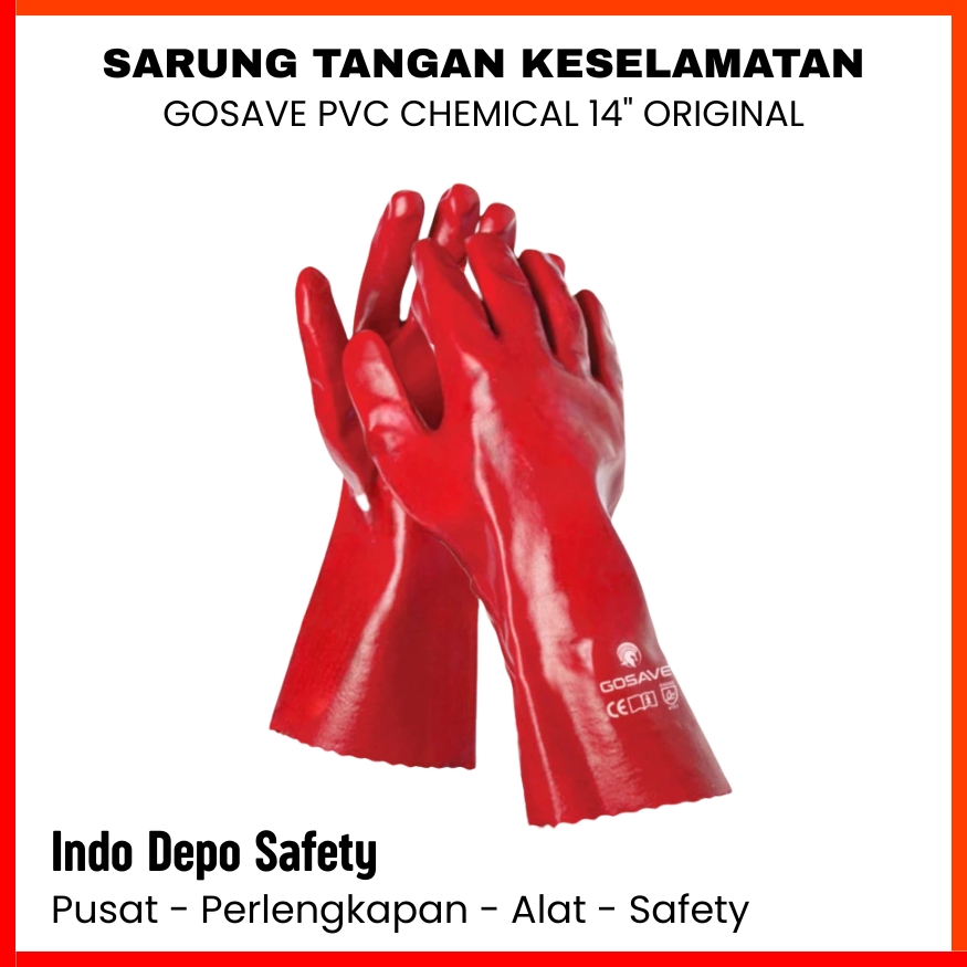 Sarung tangan gosave PVC memberikan perlindungan maksimal terhadap tangan dan sebagian lengan bawah saat bekerja di lingkungan dengan risiko cairan kimia, minyak, air, lumpur, dan bahan kotor.